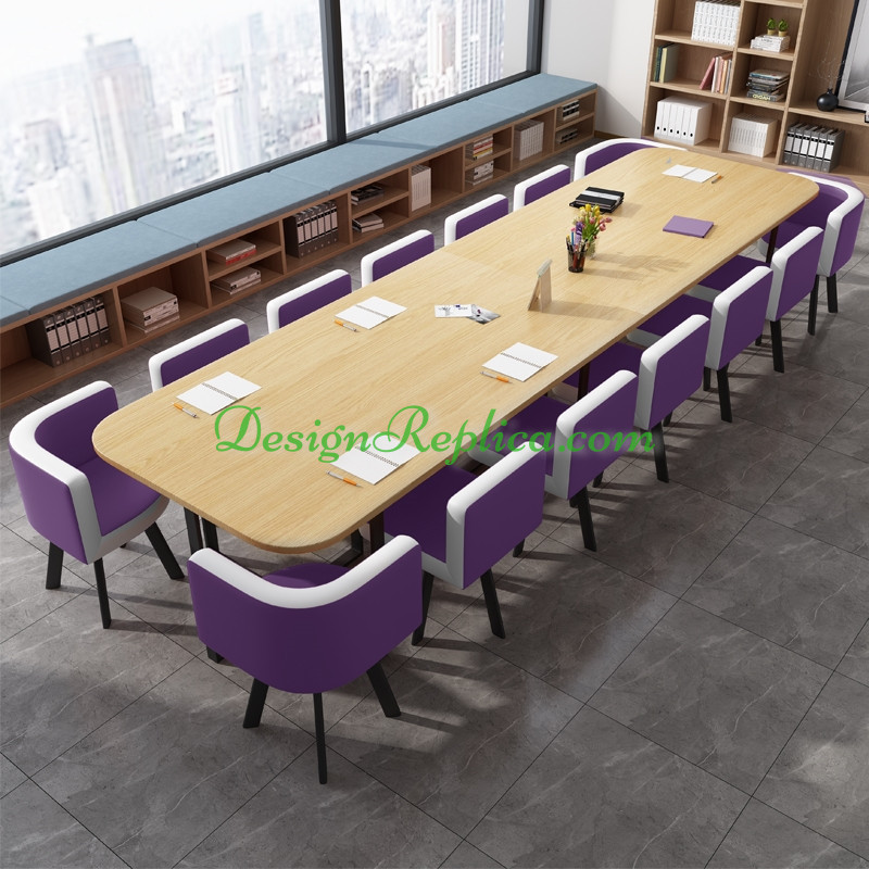 This set of elegant and modern meeting tables and chairs is perfect for any industrial or business organization. It consists of 1 table and 14 chairs in three different varieties. The first set is of a wooden-textured table top with green leather chairs. The second set features a wooden table top and blue leather chairs. The third set has a wooden table top and purple leather chairs. The fourth set features a walnut wood table top with dark blue leather chairs and the fifth set features a walnut wood table top and light blue leather chairs. The sixth set is of a white table top with yellow leather chairs and the seventh set consists of a white table top with red leather chairs. The eighth set has a white table top with light gray leather chairs and the ninth set consists of a white table top with dark gray leather chairs. Lastly, the tenth set consists of a marble table top with green leather chairs. Each of the chairs has thick cushioning with supportive backrest, and they are complete with an ergonomic design. Each of the tables and chairs sets is perfect for training, meetings, lectures, conferences, or just as a general workplace.Please be noted, our websites are under mass upgrading and the specification above was initially made by AI and will be gradually refined by humans.Thus, you may see some mistakes,or some elements will be adjusted later after your first viewing. Please feel free to contact us to get a confirmation of the product's specifications first before you place the order. And there is a chance your order may be canceled without checking first due to some inaccurate information in the specification. But please don't worry, we will double check with you after your order and only charge after your full confirmation, and if your order needs to be canceled, we will compensate you with a discount coupon. Thank you very much for all your support and attention.